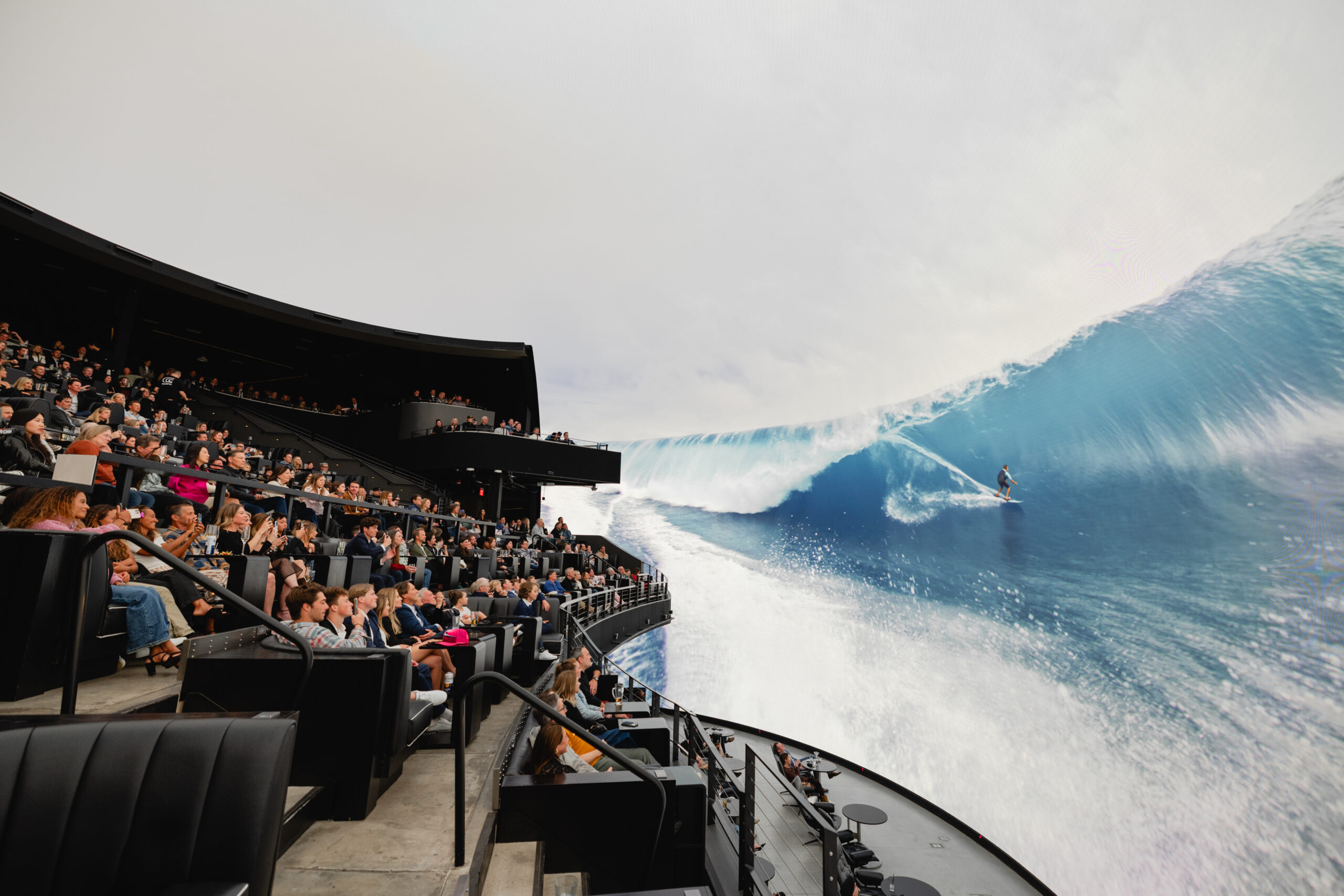 When you’re immersed in this feature, it’s like being out there on the waves with the surfers. You may experience the feeling of bobbing in the ocean, floating in water, or similar sensations to being on the ocean. When choosing your seats, anticipate that the lower you go in The Dome, such as Level 1, the more you’re immersed in the big waves.  If needed, we recommend preparing for this event the way you would for going on a boat ride.